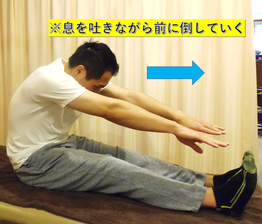2.ゆっくり吐きながら背中は丸めず股関節から上体を倒していきます。