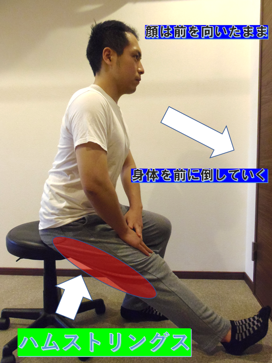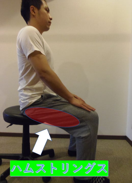 座ったまま、太ももの裏を意識してください。