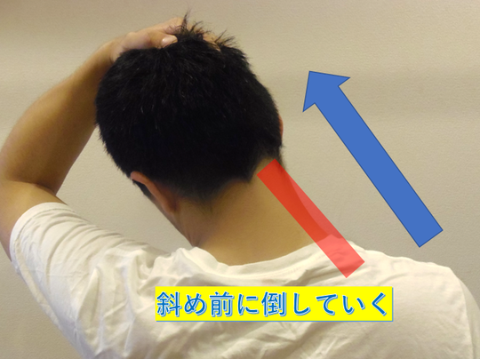 1. 斜め前に首を倒し、首の後ろの筋肉を伸ばします。