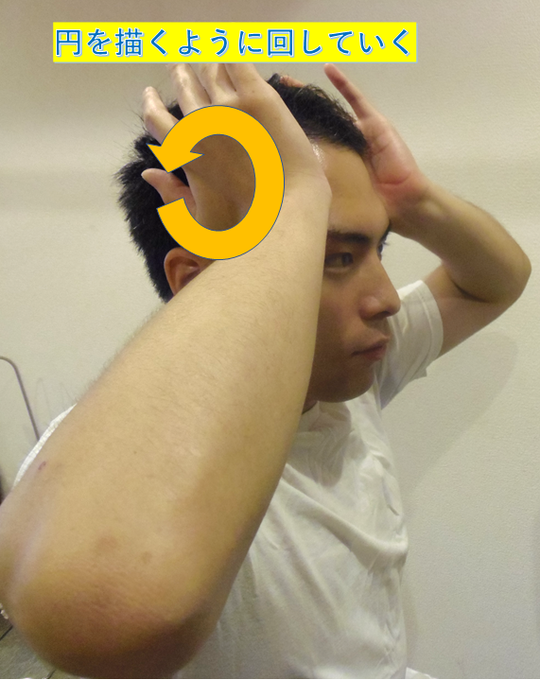 1.親指の付け根(母指球)でこめかみを軽く押さえ、円を描くようにゆっくり回します。このときのコツは表面の皮膚を引っ張るように行ってください。そうすることにより目の周りの血行が良くなります。