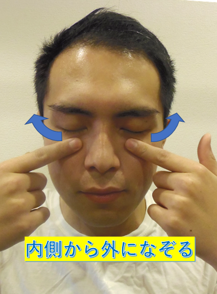 1.こめかみを軽く押さえながら軽く円を描くように 2.人差し指でやさしく目の下をなぞる