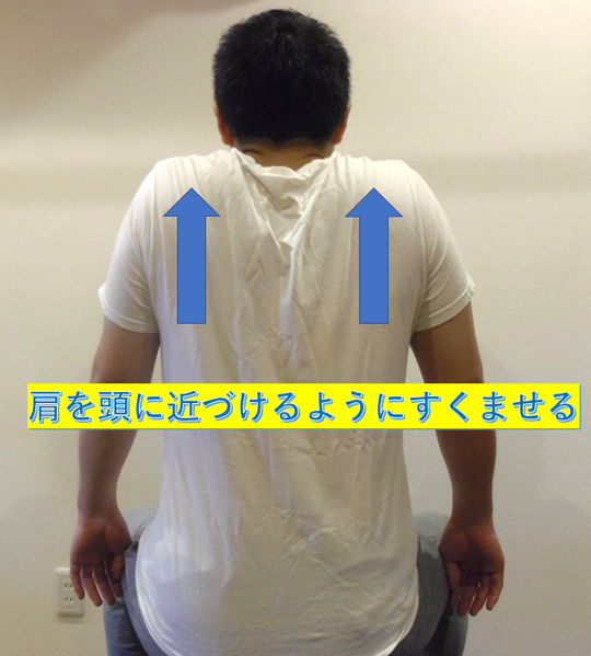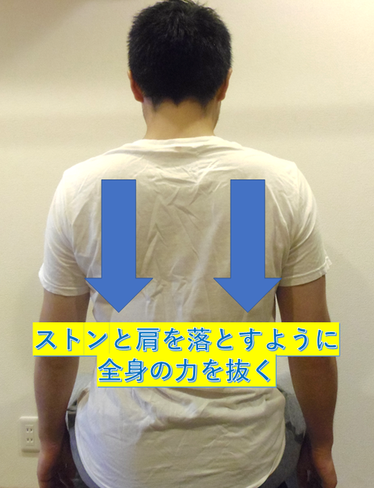 1. 肩をゆっくりすくめて、そのまま一気に力を抜いて、ストンと下に肩を落とします。