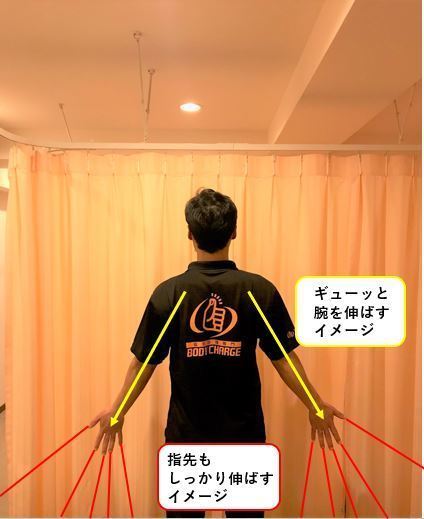 ③手のひらをパーにしたまま、指の先からビームが出ているようなイメージで、指先の延長にしっかり伸ばします。