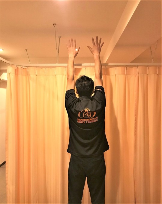 ④その腕を10秒かけて耳の横までもってきて、最後背伸びをします。